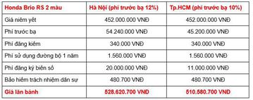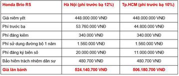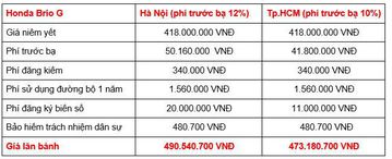 Honda Brio được phân phối tại Việt Nam với 3 phiên bản, giá bán từ 418 - 452 triệu đồng, sau khi cộng thêm các khoản thuế, phí bắt buộc, tổng giá lăn bánh của các phiên bản cụ thể như sau.