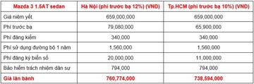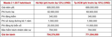 Như vậy, bản 1.5AT sedan với giá bán niêm yết 659.000.000 đồng thì sau khi cộng thêm các khoản thuế phí theo quy định của pháp luật, giá lăn bánh của bản này là 760.774.000 đồng tại Hà Nội, và 738.594.000 đồng tại TP.HCM; Bản 2.0AT sedan có giá niêm yết 750.000.000 đồng tăng lên 862.694.000 đồng tại Hà Nội và 838.694.000 đồng tại TP.HCM; và bản 1.5AT hatchback có giá niêm yết 689.000.000 sau khi tính chi phí lăn bánh sẽ tăng lên mức 794.374.000 đồng tại Hà Nội và 771.594.000 tại TP.HCM.