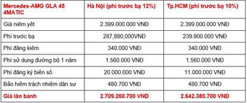 Bản cao cấp nhất là AMG GLA 45 có tổng chi phí lăn bánh tại khu vực Hà Nội khoảng 2.7 tỉ, còn tại TP.HCM, chi phí lăn bánh của phiên bản này là khoảng 2.6 tỉ đồng.