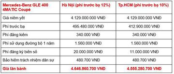 Đối với bản cao cấp hơn là GLE 400 4MATIC Coupe, tổng chi phí lăn bánh dành cho khách hàng tại khu vực Hà Nội là khoảng 4.645 tỉ đồng, và khoảng 4.555 tỉ đồng tại TPHCM.