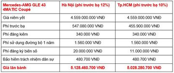 Cuối cùng, để sở hữu phiên bản cao cấp nhất là GLE 43 4MATIC Coupe, khách hàng sẽ phải chi khoảng 5.128 tỉ đồng nếu mua xe và ra biển số tại Hà Nội, và khoảng 5.028 tỉ đồng nếu mua xe và ra biển số tại TP.HCM.