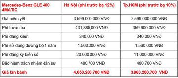 Để sở hữu GLE phiên bản 400 4MATIC, khách hàng tại khu vực Hà Nội sẽ phải bỏ ra tổng chi phí khoảng 4.053 tỉ đồng, đã bao gồm các khoản thuế, phí bắt buộc. Còn tại TPHCM, tổng chi phí mà khách hàng phải bỏ ra cho biến thể cơ sở này là khoảng 3.963 tỉ đồng.