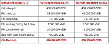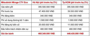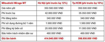 Mirage MT là phiên bản cấp thấp nhất. Sau khi cộng các khoản thuế, phí theo luật định thì giá lăn bánh của bản MT tại TP.HCM là khoảng 399 triệu đồng, và khoảng 415 triệu đồng tại khu vực Hà Nội.