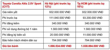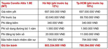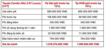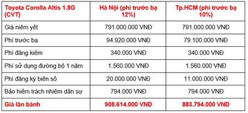 Như vậy ở Hà Nội và TP.HCM, sau khi tính tổng các loại thuế, phí thì Toyota Corolla Altis 2019 có giá lăn bánh dao động từ 780 triệu đồng- 1.066 tỉ triệu đồng với 5 phiên bản tùy chọn theo từng khu vực đăng ký.