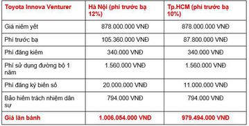 Sau khi tính tổng giá niêm yết cùng các khoản thuế, phí theo luật định, mức giá lăn bánh của Toyota Innova dao động trong khoảng từ 861 triệu - 1.110 tỉ đồng.