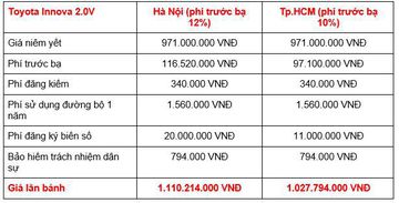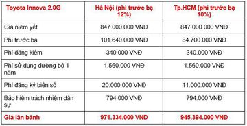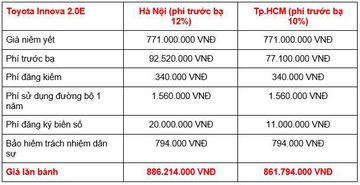 Như vậy sau khi tính tổng các loại thuế, phí thì giá lăn bánh Toyota Innova 2019 tại Hà Nội lần lượt là khoảng 861 triệu đồng với phiên bản 2.0E, 971 triệu đồng với phiên bản 2.0G, 1,006 tỷ đồng với phiên bản Venturer và 1,110 tỷ đồng với phiên bản 2.0V. Còn tại TP.HCM, giá lăn bánh của bản 2.0E là 862 triệu đồng, bản 2.0G là 945 triệu đồng, bản Venturer là 979 triệu đồng, và bản 2.0V là 1.027 tỉ đồng.