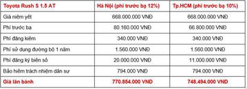 Như vậy tại Hà Nội, tổng chi phí lăn bánh của Toyota Rush là khoảng 771 triệu đồng. Còn tại khu vực TP.HCM, xe có giá lăn bánh khoảng 749 triệu đồng. Do áp dụng mức phí trước bạ và phí ra biển cao hơn nên tại Hà Nội, chi phí lăn bánh của mẫu xe này cao hơn khoảng 22 triệu đồng.