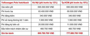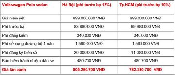 Tại Hà Nội, với mức tính phí trước bạ là 12% và phí ra biển 20 triệu đồng, cộng thêm khoảng hơn 2 triệu đồng các khoản thuế, phí bắt buộc khác thì tổng chi phí lăn bánh của Polo hatchback là khoảng 801 triệu đồng, của Polo sedan là khoảng 805 triệu đồng. Còn tại TP.HCM, với mức phí trước bạ 10% và phí ra biển 11 triệu đồng cộng thêm các khoản thuế, phí bắt buộc thì giá lăn bánh của bản hatchback là khoảng 778 triệu đồng, và của bản sedan là khoảng 782 triệu đồng.