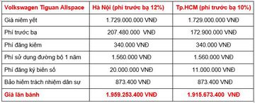 Như vậy, với mức giá niêm yết 1.729 tỉ đồng, sau khi cộng thêm các khoản thuế, phí theo luật định thì tổng chi phí lăn bánh của Tiguan tại Hà Nội là khoảng 1.959 tỉ đồng, và tại TP.HCM là khoảng 1.916 tỉ đồng.