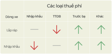 Tác động tổng hợp của các loại thuế, phí vào đầu 2018 lên ôtô lắp ráp và nhập khẩu dự kiến theo chiều hướng dưới đây. Trong đó mũi tên đi xuống tức giảm, mũi tên đi lên là tăng và gạch ngang là không bị tác động. Loại trừ yếu tố ý chí của nhà sản xuất ở từng thời điểm.
