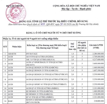Mức giảm nhiều nhất là Ford Mustang EcoBoost Convertible điều chỉnh xuống còn 2,0933 tỷ đồng, giảm đến 409,7 triệu đồng, tiếp đến là Audi Q7 45 TFSI Quattro (4MBI1) giảm 296 triệu đồng. BMW 218I Gran Tourer (6V71) cũng giảm 215 triệu đồng so với mức giá 1,603 tỷ đồng trước đó.