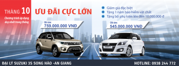 Trong tháng 10/2016 Đại lý Suzuki 3S Song Hào triển khai chương trình khuyến mãi lớn cho 2 dòng xe ô tô Vitara và Swift và 1 dòng xe tải Carry Pro.