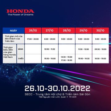 Honda Việt Nam (HVN) sẽ tham gia Triển lãm Ô tô Việt Nam 2022 được tổ chức tại Trung tâm Hội chợ và Triển lãm Sài Gòn (SECC) từ ngày 26 đến 30 tháng 10 năm 2022 với nhiều mẫu xe trưng bày ấn tượng cùng những hoạt động trải nghiệm thú vị dành cho khách hàng.