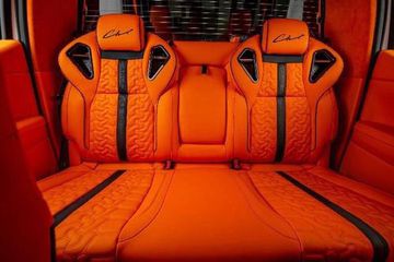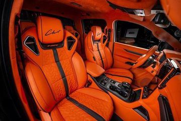 Bên cạnh đó, ở bảng phía trước hộc để đồ tại ghế phụ và tựa đầu có dòng chữ "T-REX" còn có chữ ký của hãng độ Carlex. Toàn bộ ghế ngồi đều có logo Carlex Design làm điểm nhấn.