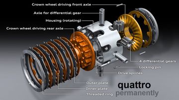Với Audi, hãng xe luôn theo đuổi triết lý dẫn động cơ khí hoàn hảo, mềm mại và khác biệt, thế hệ Quattro cuối cùng hiện đại nhất sử dụng bánh răng Vương miện. Về cấu tạo thì nhìn khá giống vi sai Open thuần túy, tuy nhiên nó sở hữu khả năng thay đổi lực kéo từ 85/15 đến 30/70. Việc thay đổi này dựa trên 1 phát minh đến từ Thụy Sĩ, nó rắc rối như các bánh răng đồng hồ và tất nhiên cũng như rất chính xác. Đây là loại Awd Permanently của Audi, một trong các hệ thống mà Audi sử dụng cho xe của họ. Bao phủ phía ngoài là Traction Control, bởi vì Torsen không thể truyền 100% lực kéo như các đĩa côn khóa cứng, nên TC sẽ là phương án dự phòng dành cho những trường hợp quá đà.