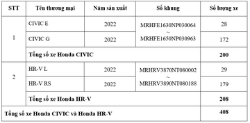 Honda Việt Nam (HVN) vừa ra thông báo triển khai chiến dịch triệu hồi 408 chiếc Civic và HR-V đời 2022 sản xuất năm 2022 do HVN nhập khẩu từ Thái Lan để thay thế khung đệm ghế lái.