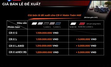 Honda Ô tô Việt Nam vừa chính thức giới thiệu Honda CR-V 2024 với giá bán từ 1.109 tỉ đồng - 1.259 tỉ đồng. Xe có 04 phiên bản gồm G, L, L AWD, e:HEV RS.