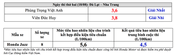 Kết thúc hành trình hơn 400 km tại đại lý Honda Ô tô Nha Trang qua nhiều loại địa hình từ đường đô thị, cao tốc tới đường đèo, dốc và trong điều kiện di chuyển thông thường, toàn bộ các xe tham gia đã về đích an toàn và đạt kết quả tiêu hao nhiên liệu trung bình như sau: