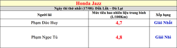 Tuy ngày đầu tiên của hành trình khá khăn với đặc thù địa hình và chất lượng mặt đường nhưng các tài xế đã nỗ lực thay đổi thói quen lái xe và gặt hái được những con số khá đáng nể. Bên cạnh đó cũng thể nhắc đến phần "công sức" lớn nhất từ chiếc Honda Jazz với khả năng tiết kiệm nhiên liệu đầy ưu việt khi phải vượt qua quãng đường gần 210km đèo dốc, đường xấu và chinh phục độ cao gần 1000 mét.