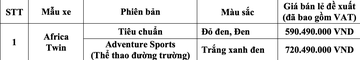 Africa Twin với hai phiên bản dự kiến sẽ được bán chính thức tại hệ thống Cửa hàng xe Phân khối lớn Honda trên toàn quốc vào ngày 15 tháng 2 năm 2023 với chế độ bảo hành 2 năm, không giới hạn km và giá bán như sau: