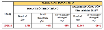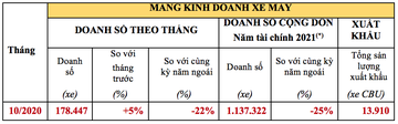• Brio với 304 xe bán ra, chiếm 17% tổng doanh số bán ôtô của HVN trong T10/2020.