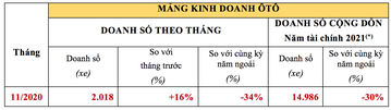 • Brio với 329 xe bán ra, chiếm 16% tổng doanh số bán ôtô của HVN trong T11/2020.