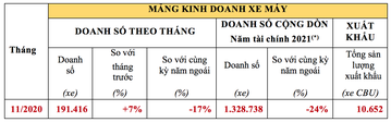 Doanh số: 191.416 xe, tăng 7% so với tháng trước và giảm 17% so với cùng kỳ năm ngoái, cụ thể: