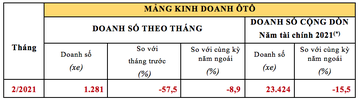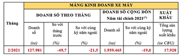 Công ty Honda Việt Nam (HVN) thông báo doanh số bán lẻ mảng kinh doanh xe máy & ô tô trong tháng 2/2021. Kết quả được tổng hợp bởi Cửa hàng Bán xe và Dịch vụ do Honda Ủy nhiệm / Nhà Phân phối ô tô Honda giao cho khách hàng và theo ước tính của HVN.