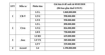 Ngoài CR-V, 3 mẫu xe khác nhập khẩu nguyên chiếc từ Thái Lan gồm Civic, Jazz và Accord sẽ tiếp tục được Honda Việt Nam phân phối đến khách hàng với mức giá mới hấp dẫn. Cụ thể, Honda Việt Nam chính thức nhận đặt hàng các mẫu xe này thông qua các Đại lý Ôtô Honda trên toàn quốc từ ngày 05/03/2018, thời gian giao xe dự kiến trong Quý 2/2018 với mức giá bán lẻ đề xuất như sau: