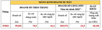 - Từ tháng 4/2021 tới hết tháng 9/2021, doanh số cộng dồn của xe máy đạt đạt hơn 835,5 nghìn xe, giảm 12,9% so với cùng kì năm ngoái. Thị phần đạt 80,8%, tăng 0,7% so với cùng kì năm ngoái