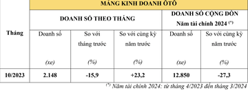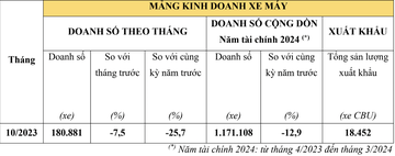 Công ty Honda Việt Nam (HVN) thông báo doanh số bán lẻ mảng kinh doanh xe máy & ô tô trong tháng 10/ 2023. Kết quả được tổng hợp bởi Cửa hàng Bán xe và Dịch vụ do Honda Ủy nhiệm/Nhà Phân phối ô tô Honda giao cho khách hàng và theo ước tính của HVN.