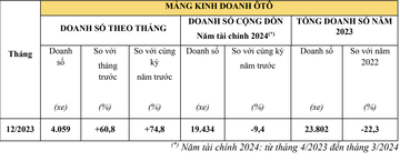 2/ DOANH SỐ BÁN Ô TÔ: 4.059 xe, tăng 60,8% so với tháng trước và tăng 74,8% so với cùng kỳ năm trước. Tổng doanh số cả năm 2023 là 23.802 xe, giảm 22,3% so với năm 2022, cụ thể: