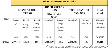 Công ty Honda Việt Nam (HVN) thông báo doanh số bán lẻ mảng kinh doanh xe máy & ô tô trong tháng 12/2023. Kết quả được tổng hợp bởi Cửa hàng Bán xe và Dịch vụ do Honda Ủy nhiệm/Nhà Phân phối ô tô Honda giao cho khách hàng và theo ước tính của HVN.