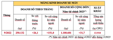 ● Dòng xe côn tay: Winner X, doanh số đạt 11.444 xe, chiếm 4,6% tổng Doanh số bán xe máy của HVN trong tháng 9/2022.