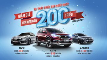 Honda Ô tô Việt Nam thực hiện chương trình kích cầu cho các mẫu Civic, Accord và CR-V với mức giảm giá từ 52 đến 192 triệu đồng. Các mức giá mới mà Honda áp dụng cho các mẫu xe của hãng sẽ bắt đầu từ ngày 08/08/2017.