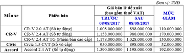 Từ đầu năm 2017, toàn thị trường có dấu hiệu chững lại do tâm lý chờ đợi của khách hàng để mua xe với mức giá tốt hơn vào năm 2018. Với mong muốn khách hàng có thể sở hữu ngay các mẫu xe yêu thích với tính thực dụng cao, cảm giác lái vượt trội, tính năng an toàn hàng đầu và mức giá hợp lý; đồng thời gia tăng “niềm vui cầm lái” các mẫu xe mang thương hiệu Honda cho nhiều khách hàng hơn nữa. Cụ thể từ ngày 08/08/2017, hãng xe Nhật Bản tiến hành điều chỉnh giá bán lẻ đề xuất cho 3 mẫu xe Honda CR-V, Honda Civic và Honda Accord như sau: