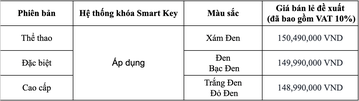 Mức giá bán lẻ đề xuất của mẫu xe như sau: