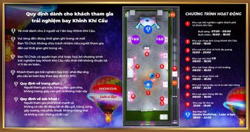 • Trải nghiệm khinh khí cầu bằng công nghệ VR thực tế ảo: Trải nghiệm không gian thành phố dưới những góc nhìn vô cùng mới lạ hi vọng sẽ tạo nên dấu ấn đậm chất cho những khách hàng tham dự. Ngoài ra, trong các ngày diễn ra sự kiện, nếu điều kiện thời tiết lý tưởng, các khách hàng sẽ có cơ hội trải nghiệm khinh khí cầu ngắm thành phố và săn hình trên không.