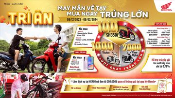 • Cơ hội tham gia quay số may mắn và trúng đến 3.100 xe máy (100 Sh350i, 1.000 Vision, 2.000 Wave Alpha), cùng hàng trăm ngàn quà tặng có giá trị như điện thoại Samsung A05s, phiếu ưu đãi phụ kiện trị giá lên đến 1,2 triệu đồng, thẻ điện thoại trị giá lên đến 1 triệu đồng, cùng hỗ trợ ưu đãi lãi suất chỉ từ 0,79% khi mua xe máy mới.
