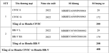 Công ty Honda Việt Nam (HVN) triển khai chiến dịch triệu hồi dự kiến từ ngày 05/10/2022 để thay thế khung đệm ghế lái của loại xe Honda CIVIC và Honda HR-V sản xuất năm 2022 do HVN nhập khẩu từ Thái Lan.