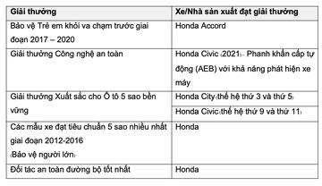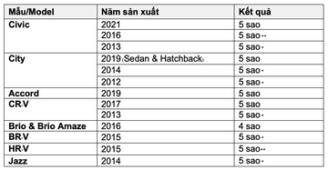 Thành tích này một lần nữa khẳng định cam kết của Honda trong nỗ lực mang lại sự tự do và an toàn khi di chuyển cho tất cả người tham gia giao thông.Hơn 10 năm qua, Honda đã có 8 mẫu xe tham gia thử nghiệm tại ASEAN NCAP và đạt được những kết quả đánh giá xuất sắc.