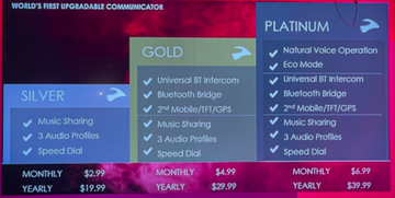 Với người dùng mua gói Bạc, ngoài các tính năng cơ bản nhất theo danh sách ở trên, sẽ có thêm các tính năng như chia sẻ âm nhạc, danh sách chơi nhạc và gọi điện thoại nhanh. Gói Vàng sẽ có tính năng của gói Bạc và hệ thống trò chuyện nội bộ bằng Bluetooth qua kênh thứ 2. Các biker chọn mua gói Bạch Kim sẽ có toàn bộ tính năng của gói Bạc + Vàng và thêm tính năng ra lệnh bằng giọng nói hay chế độ tiết kiệm pin.
