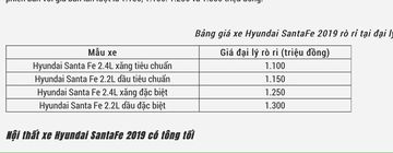 Cụ thể, theo thông tin từ đại lý, Hyundai SantaFe bản xăng tiêu chuẩn có giá 1,1 tỷ đồng, bản động cơ diesel 2.2L tiêu chuẩn có giá 1,150 tỷ đồng. Hai biến thể cao hơn là xăng 2.4L đặc biệt và diesel 2.2L đặc biệt có giá lần lượt 1,250 và 1,3 tỷ đồng.