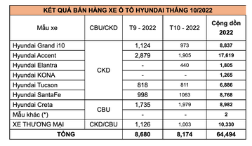 TC Group (Tập đoàn Thành Công) thông báo kết quả bán hàng Hyundai tháng 10/2022. Theo đó, tổng doanh số xe Hyundai tháng 10 đạt 8.174 chiếc.
