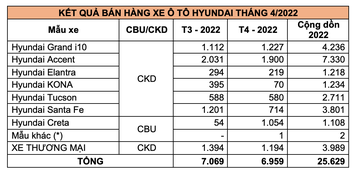 Hyundai Accent tiếp tục là mẫu xe có số lượng bán hàng tốt nhất tháng 4 với 1.900 xe đến tay khách hàng, giảm 6,5% so với tháng 3/2022. Hyundai Grand i10 đứng ở vị trí thứ 2 với 1.227 xe, tăng trưởng 10,3% so với tháng 3/2022. Mẫu xe B-SUV Hyundai Creta khi nguồn cung đã ổn định ghi nhận sức tăng trưởng vượt bậc với 1.054 xe bán ra. Các mẫu xe thương mại mang thương hiệu Hyundai tiếp tục có doanh số tốt với 1.194 xe bán ra.
