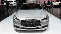 Nhìn chung, phiên bản thương mại của Infiniti Q60 không quá khác biệt so với bản concept từng được giới thiệu vào năm 2015. Ở phần đầu xe, Q60 2017 được trang bị với lưới tản nhiệt lớn dạng trăng lưỡi liềm, kết hợp cùng cụm đèn pha LED với công nghệ Light Guide “giống hệt" mí mắt con người, tạo cảm giác chiếc xe như đang “chằm chằm’’ vào người đối diện nó.
