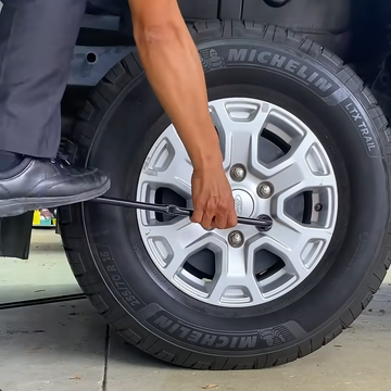 Bước 1: Nới lỏng ốc bánh xe: Anh em dùng tuýp mở ốc theo xe, lắp vào từng con ốc và vặn ngược chiều kim đồng hồ khoảng nửa vòng đến một vòng. Nhớ là chỉ nới lỏng thôi nha, chưa tháo hẳn ra đâu. Làm lúc này bánh xe còn nằm trên mặt đất sẽ có lực giữ, dễ vặn hơn nhiều so với khi đã kích xe lên.