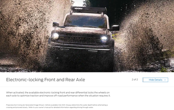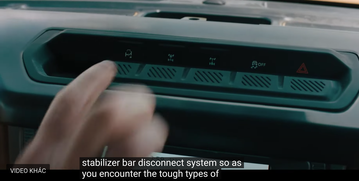 Đáng kinh ngạc là Ford Bronco có thêm hệ thống ngắt kết nối thanh cân bằng đặt ở cầu trước. Thanh cân bằng là hệ thống gia cố khung gầm có tác dụng giảm góc chênh lệch cao thấp của hai bánh xe ở cầu trước để giảm độ nghiêng thân xe khi vào cua tốc độ cao.