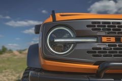 Phong cách hiện đại và công năng sử dụng được kết hợp khéo léo từ đèn pha dạng led và dải đèn led ban ngày kết nối chữ Bronco trên lưới tản nhiệt. Phía dưới là đèn led tăng sáng và hai lỗ gài móc kéo đẹp mắt. Ford Bronco được phát triển gần 200 loại phụ kiện khác nhau để khách hàng tự do cá nhân hoá chiếc xe của mình. Đây cũng tiếp tục là lợi ích nếu được đặt sẵn từ khi xuất xưởng, giúp tránh rắc rối khi kiểm định phương tiện nếu tự nâng cấp.
