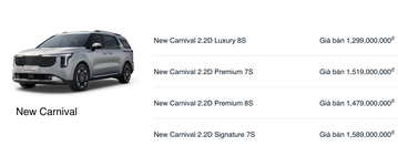 Với tất cả 04 phiên bản, Kia New Carnival đáp ứng đa dạng nhu cầu của khách hàng. Phiên bản cao cấp nhất Signature dành cho khách hàng là gia đình, doanh nhân, nghệ sĩ hay quản lý cao cấp đang mong muốn sở hữu một chiếc SUV sang trọng với tiện nghi đẳng cấp thương gia và an toàn thông minh cao cấp.